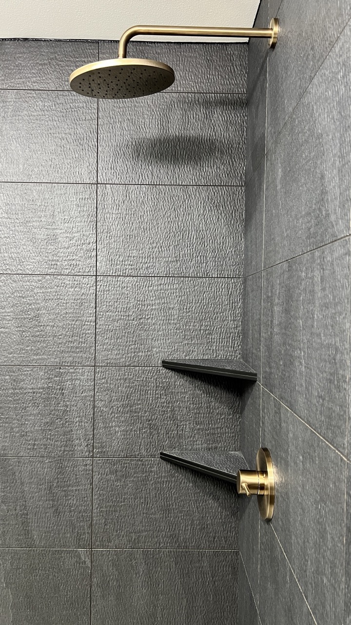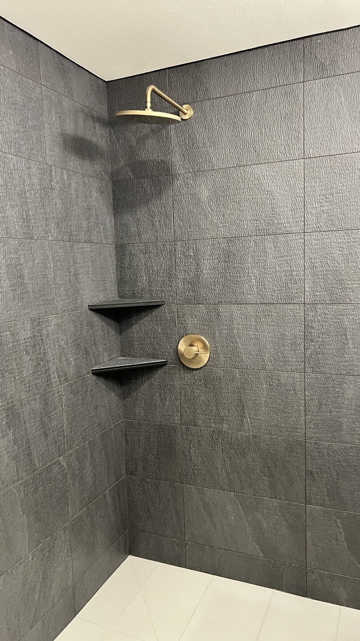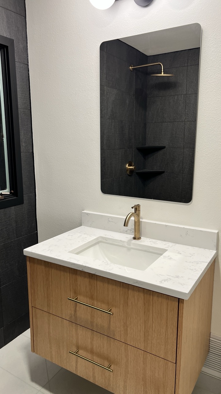 This guest bath remodel was designed to bring a bold, modern look to the home while maximizing comfort and function. The space features a striking full-height charcoal tile shower with a textured finish, paired with warm brushed brass fixtures for a clean, upscale contrast. A walk-in shower design, oversized rain head, and custom floating corner shelves create a sleek, spa-inspired feel while keeping the space practical for everyday use.